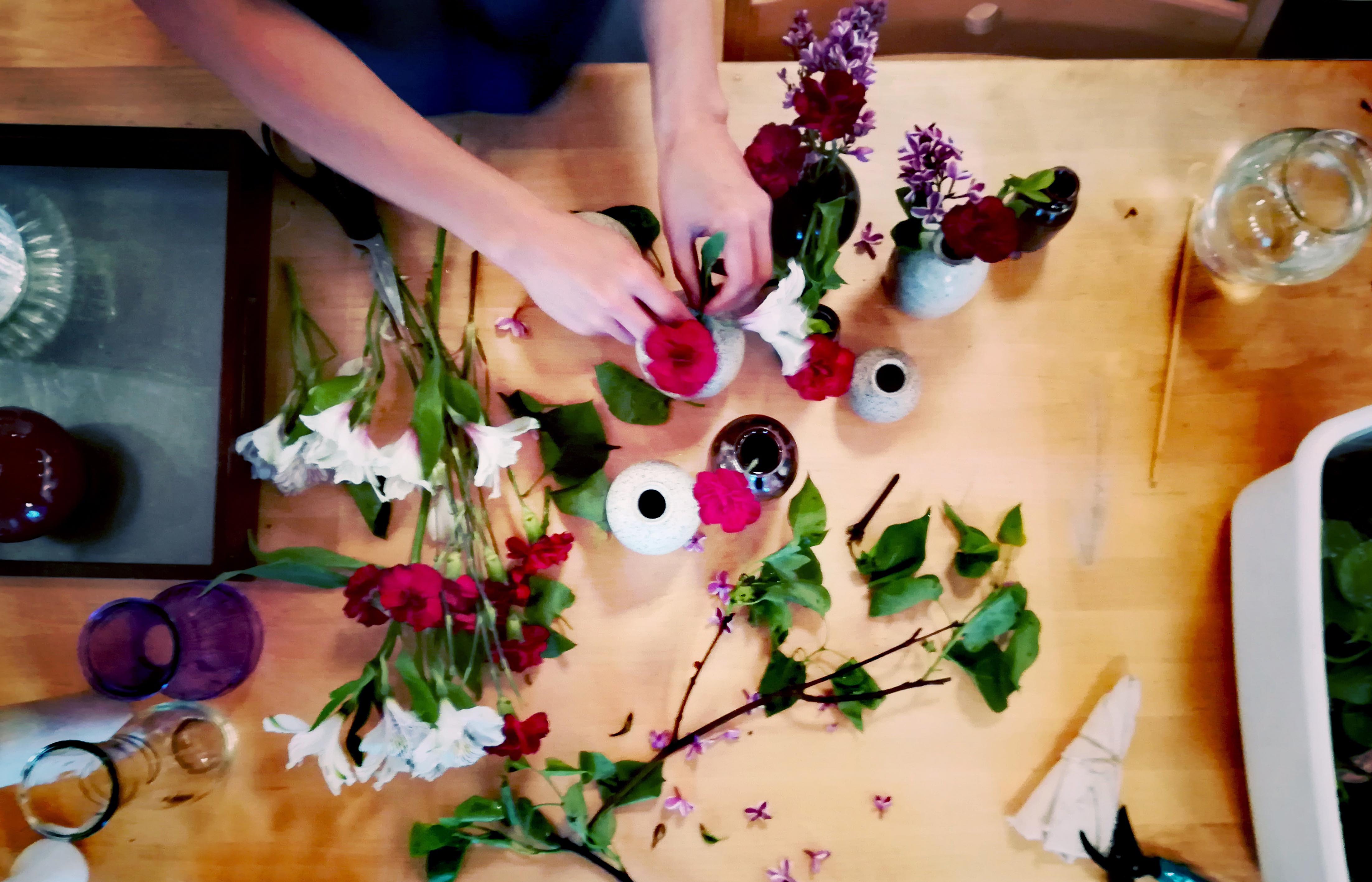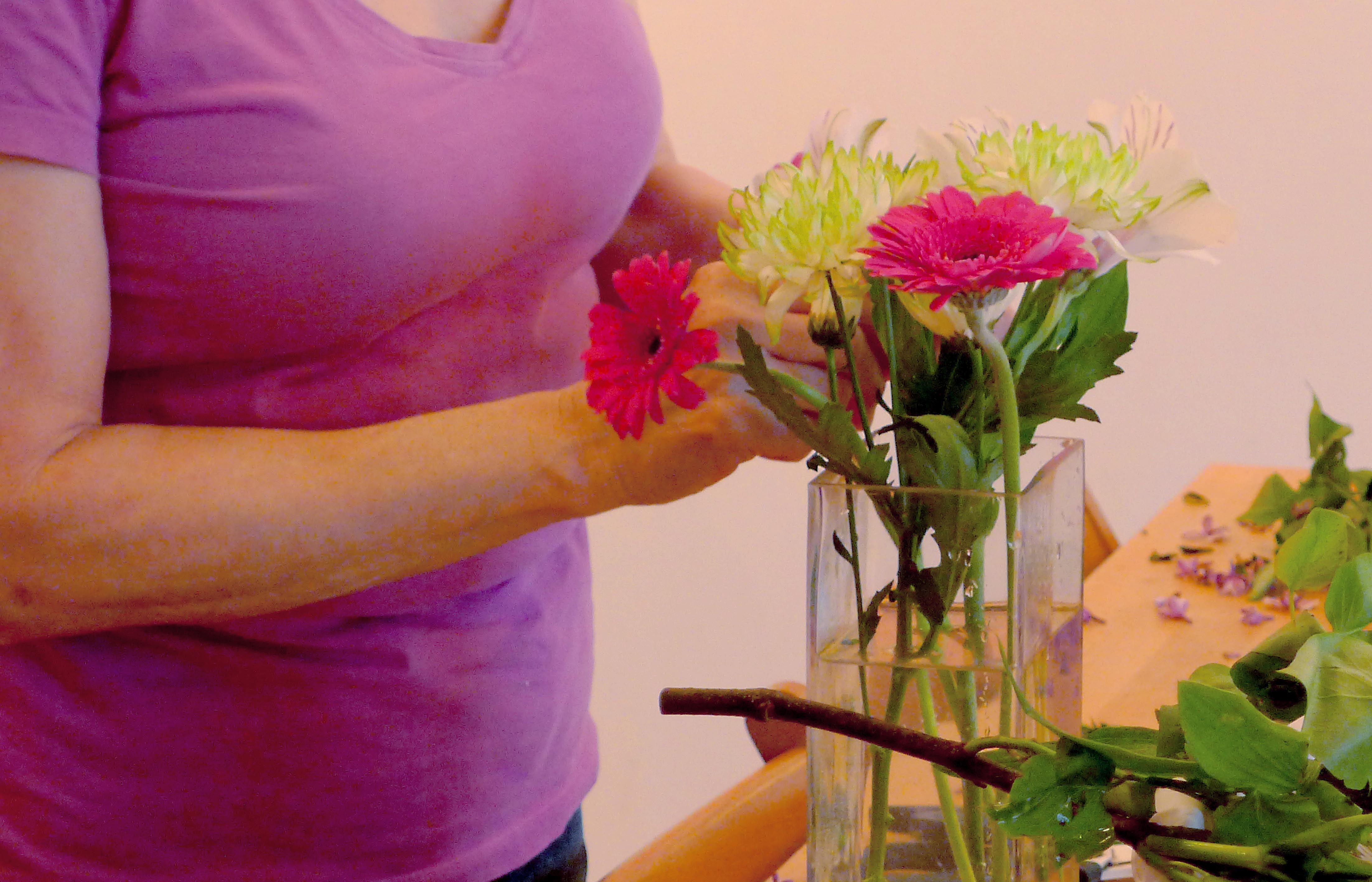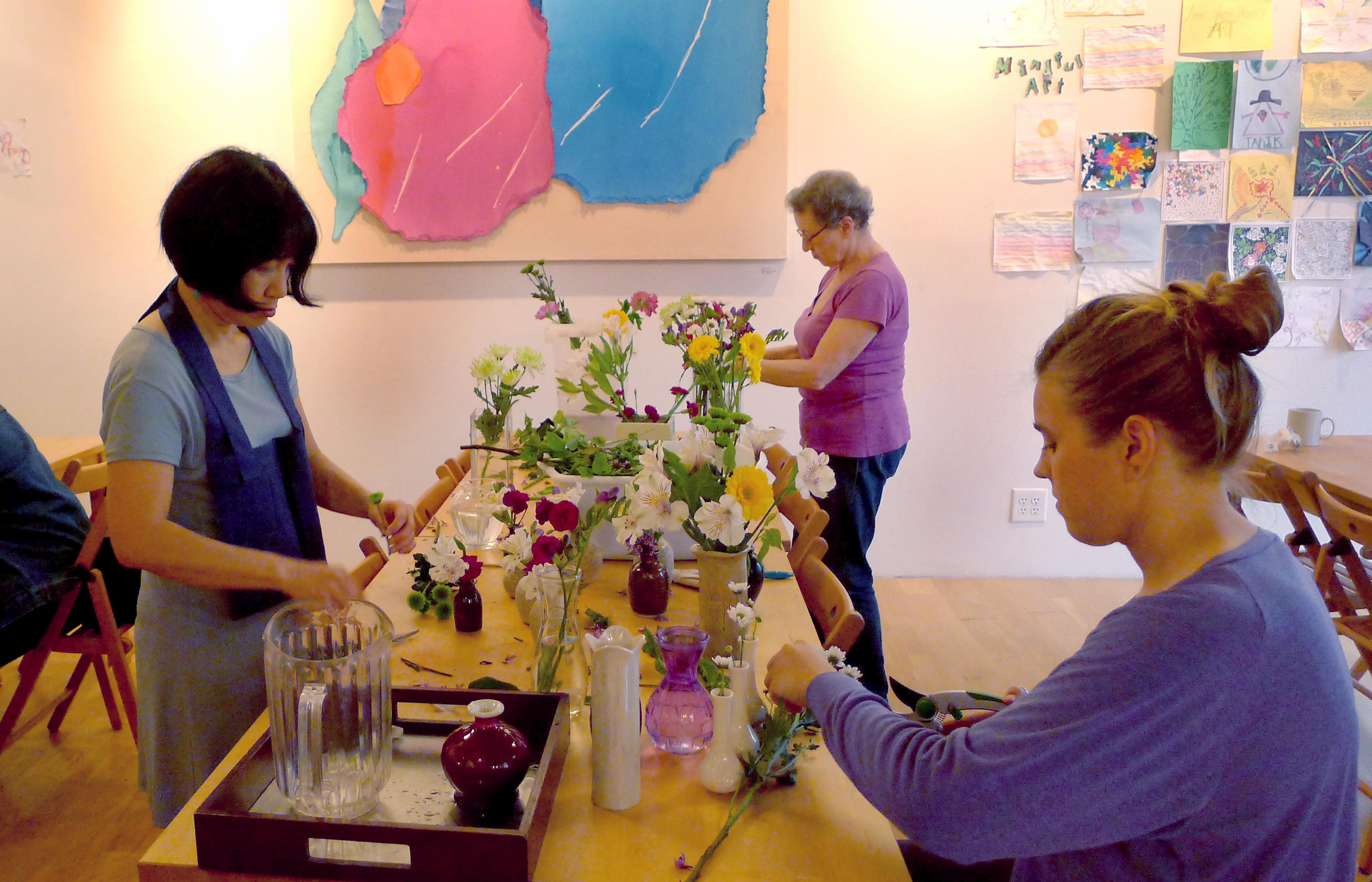 Every week at BZC a team of dedicated sangha members engages in a special form of practice. They use scissors, vases, and brushes. They speak softly with each other, while moving swiftly around the zendo, the kitchen, the bathroom, the teachers’ practice rooms, the library. They work carefully with their hands, paying special attention to colors and shapes, deciding on particular arrangements and combinations – what to discard and what to keep, how to evenly distribute what’s available, what should go where.