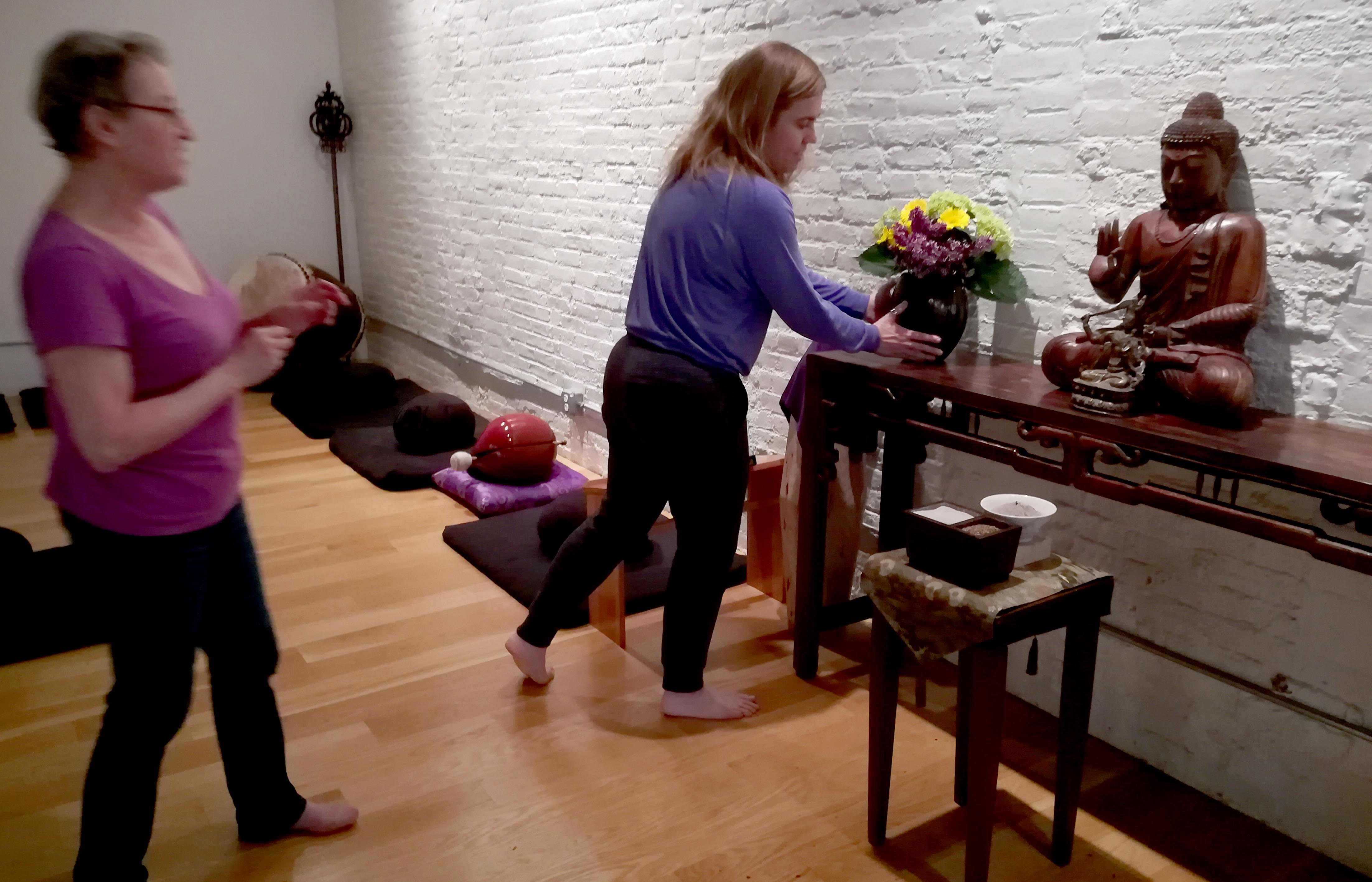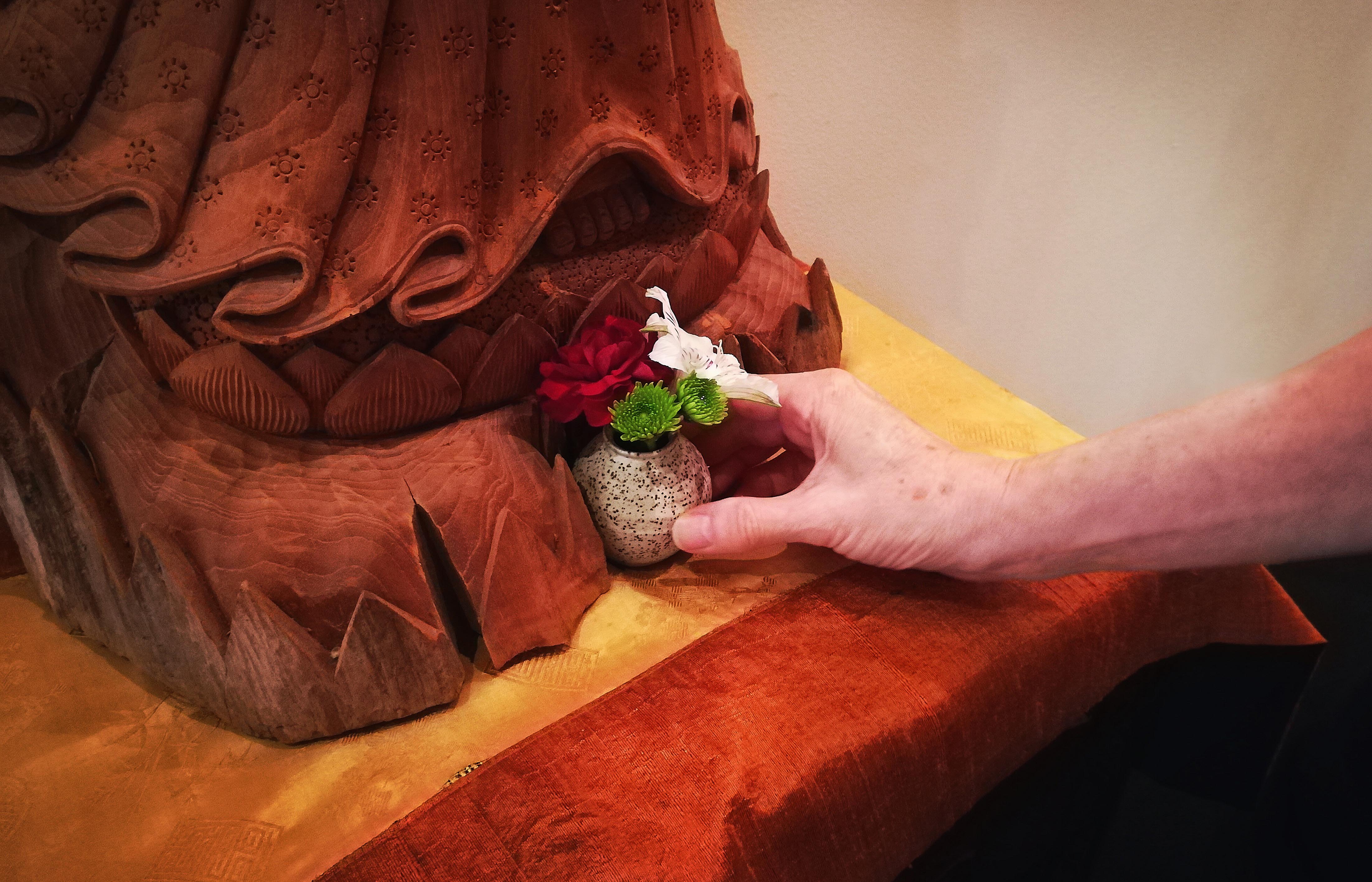 These are the flower people, the sangha members who take care of the many floral arrangements at BZC. Every week they go over more then a dozen vases, big and small and tiny, refreshing each one with care and diligence and arranging new bouquets made of bright colors and delicate patterns. They make sure each arrangement includes flowers representing the three jewels (Buddha, Dharma and Sangha), maintaining an art form developed over the centuries in Buddhist temples in Japan. Practicing moment-to-moment mindfulness, the flower team arranges buds, stems and leaves in the tradition of this art form known as ikebana, which literally means “living flowers” – even if the flowers have been cut and are no longer growing, they are being given new life in these arrangements.