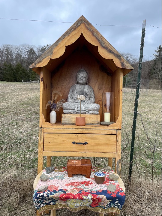This time, in mid-April, the sky was perceptibly lighter. Bright enough to read the han by, and bright enough to see my hand. The first morning, I brought the lantern out with me anyway and kept it on. The second day, I turned it off. And I could still see. That’s how I know spring is here, how I can feel it in my body: the sun rises earlier and earlier, as if rising to meet us and our practice. Another sign of spring: on the altar at Ancestral Heart, we have fresh flowers again.