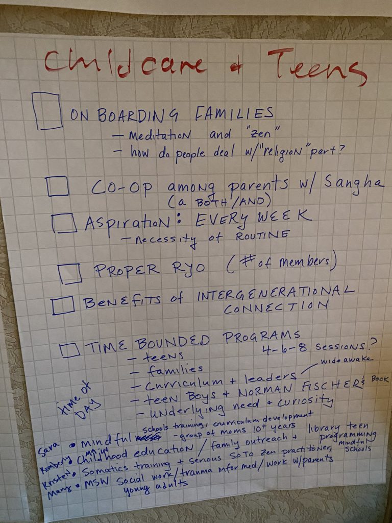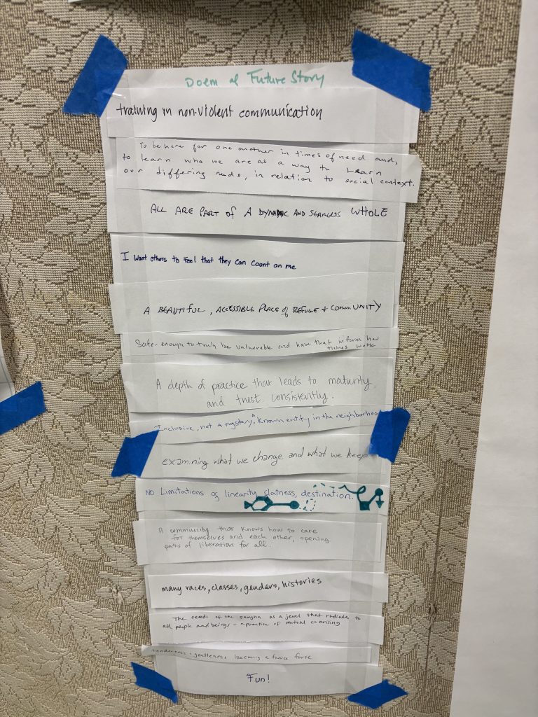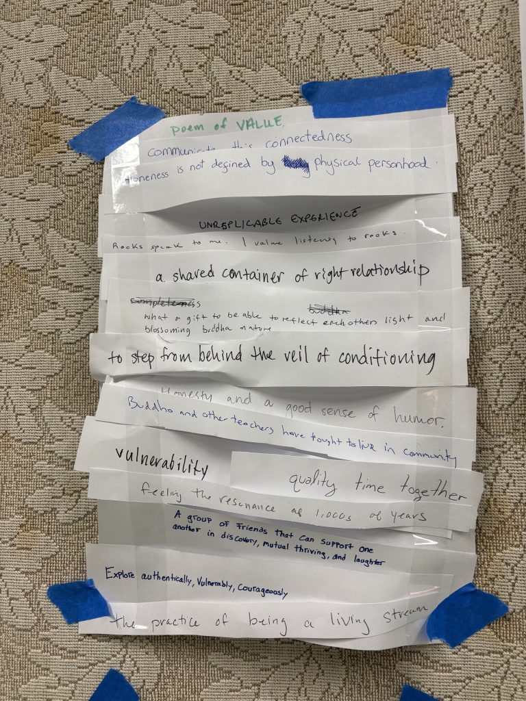 Sarah Sensei guided writing practice on what we value and what the future story is for our sangha. Participants’ visions were written on strips of paper that became a collective poem of hopes and intentions. Read the transcriptions here.