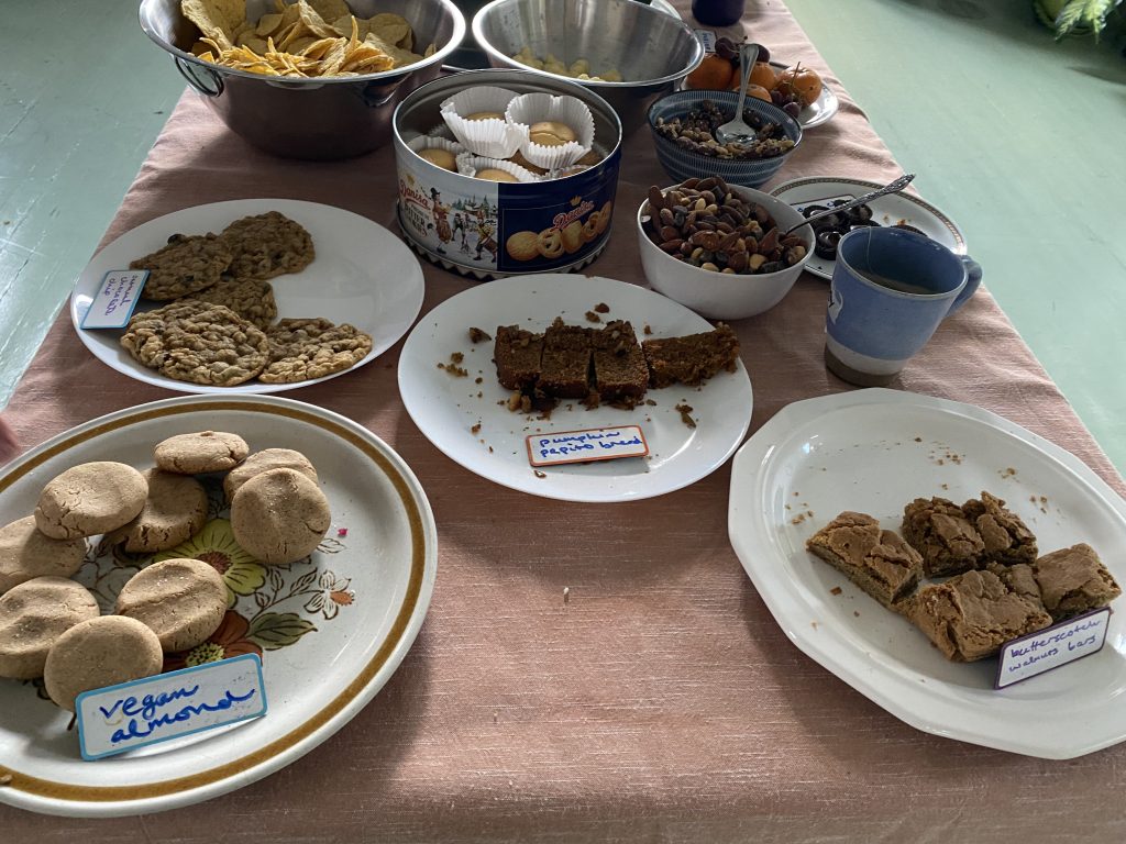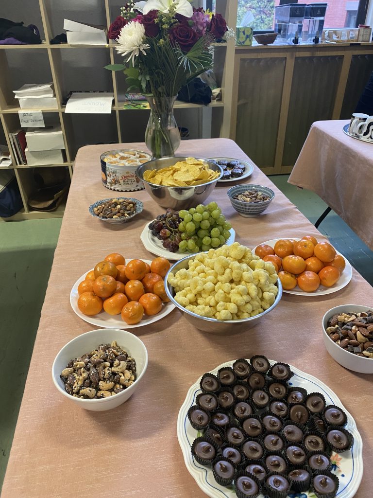 Throughout the day, people contributed homemade baked goods, fruit and nuts, chips and candy, and tea.