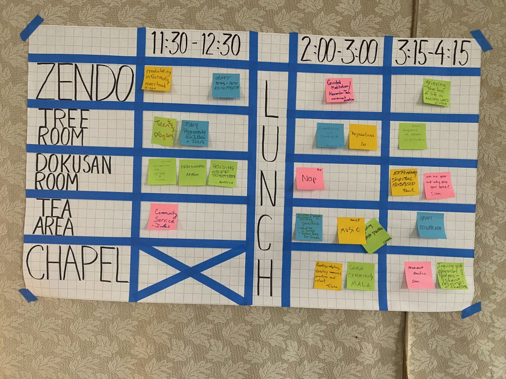 After reviewing our Community Agreements, we tried something new: Open Space Technology. Despite the name, it’s not about tech at all, but rather an organic, self-organizing approach where participants propose and gather around topics that call to them. After a few moments of confusion and apprehension, people dove in. What emerged was a rich tapestry of the sangha’s interests, concerns, and dreams.