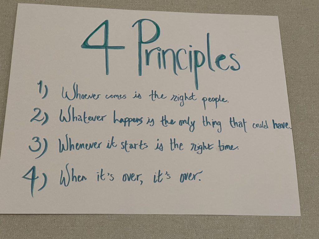 Open Space’s guiding principles: whoever comes is the right people, whatever happens is the only thing that could have, whenever it starts is the right time, when it’s over, it’s over. The Open Space format also invited two ways of participating: people could be bees, going deep and staying with one conversation or activity, or they could be butterflies, flitting about following their own interests and timing. Both approaches were honored. Both were practice.