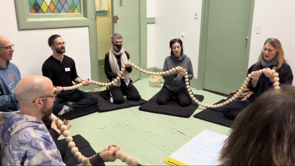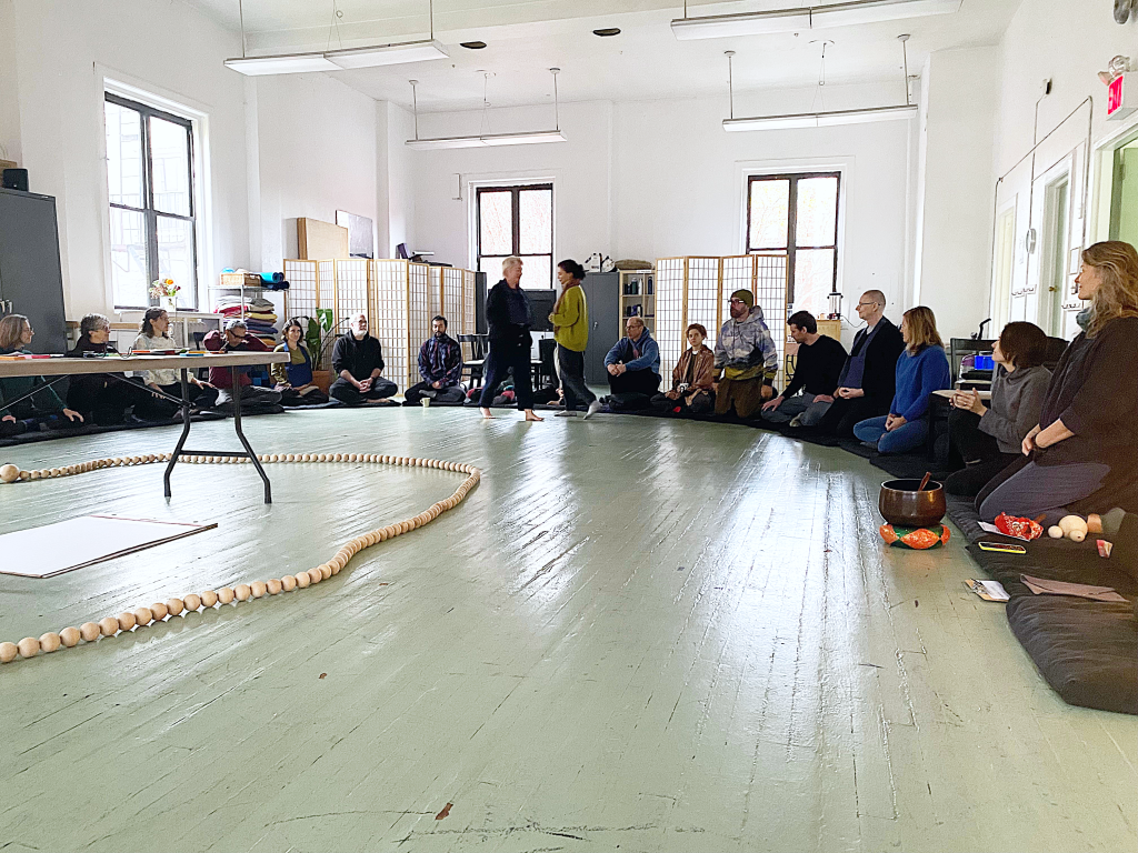 The zendo, tea area, dokusan room, and tree room came together with many hands helping. We sat zazen in a circle, facing inward toward one another. Sara Lamm led a Community Mala practice with giant wooden beads, adapted for our large group. We invited in our ancestors and all parts of ourselves, chanting together.